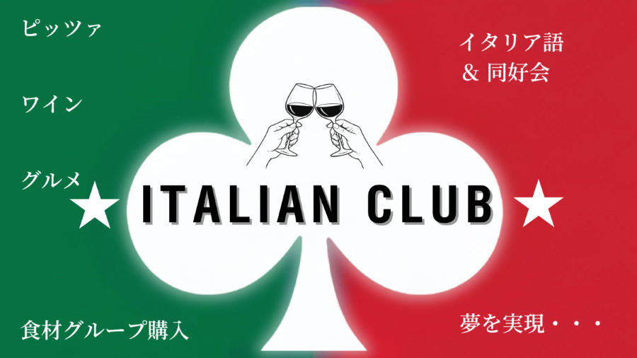 CLUBイタリアの美味しさを探求し、ピッツァでのオフ会も楽し。夢、好き、得意を同好会で発信。オーナーがイタリア人・伊語講師・伊在住の生産者なので、イタリアを深く追求でき、生産品やグルメ食材等をお安く購入出来るのがメンバーの特権!